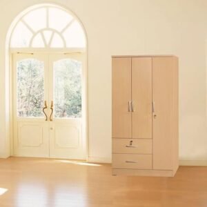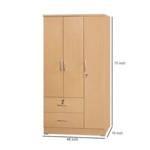 ABBAJI INTERIORS Engineered Wood Three-Door Wardrobe 5 Shelves and 2 Drawer with Classy Look (Color-Light Brown)-Length 48inch,Width 19inch,Height 75inch