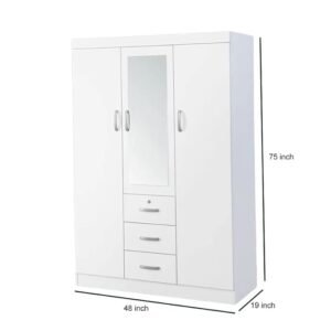 ABBAJI INTERIORS Engineered Wood Three-Door Wardrobe 4 Shelves and 3 Drawer and Mirror (White Color)-Length 48inch,Width 19inch,Height 75inch