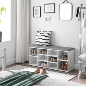 ABBAJI INTERIORS Engineered Wood Shoe Rack Storage Bench with cushion seat, 10 Shelf -for Entryway, Living Room, Office (White) 48 inch length, 18″ height, 16″ deep