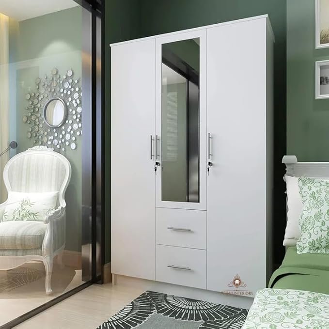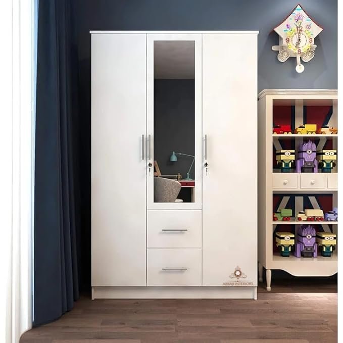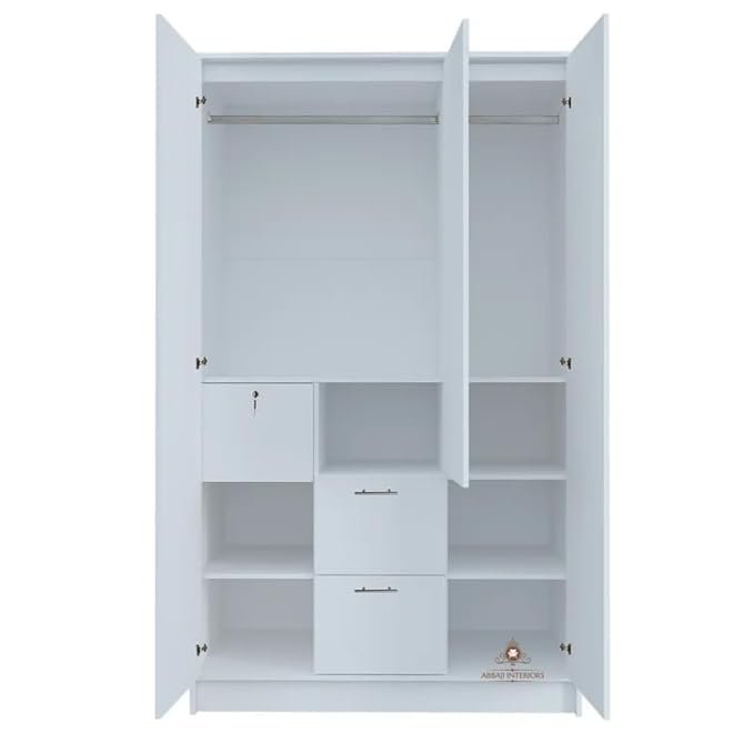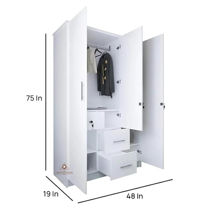 Be the first to review “ABBAJI INTERIORS Engineered Wood Three-Door Wardrobe with 3 Drawer 8 Shelves -Length 48 inch,Width 19inch,Height 75inch (White)” Cancel reply