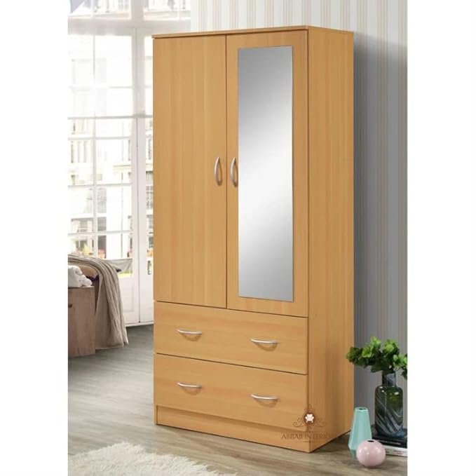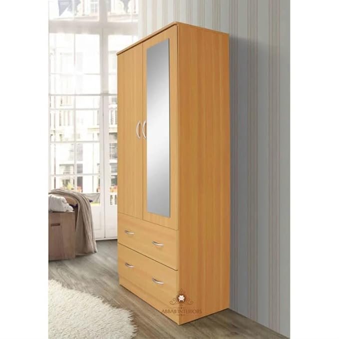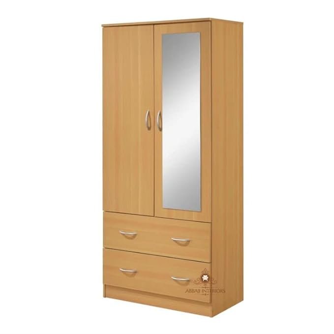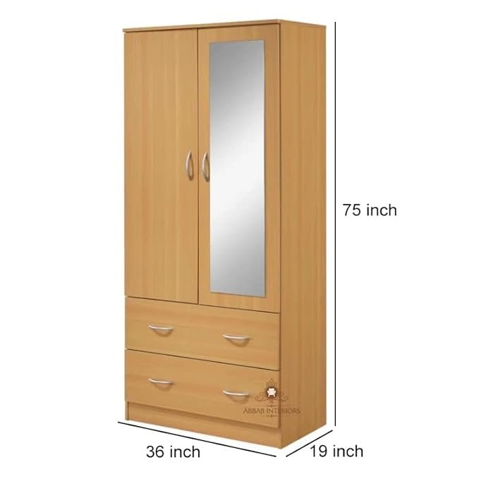 ABBAJI INTERIORS Engineered Wood Two-Door Wardrobe 2 Drawer with Mirror (Light Brown-Color)-Length 30inch,Width 19inch,Height 75inch